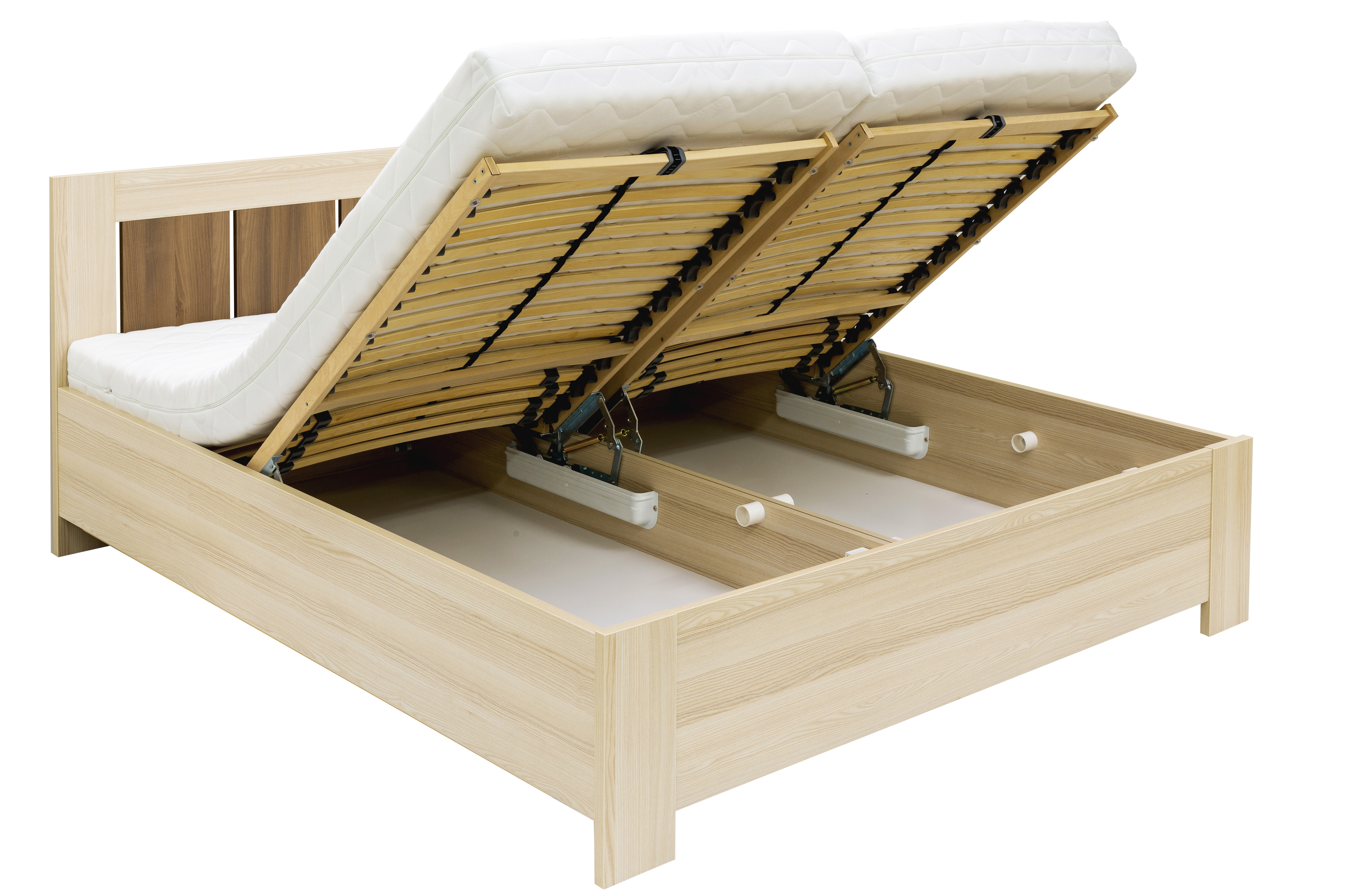 Materiál lamino tl.25 mm.Dvoulůžko s úložným prostorem přístupnýmod nohou. Polohovací rošty v ceně. Výběr z více dekorů.