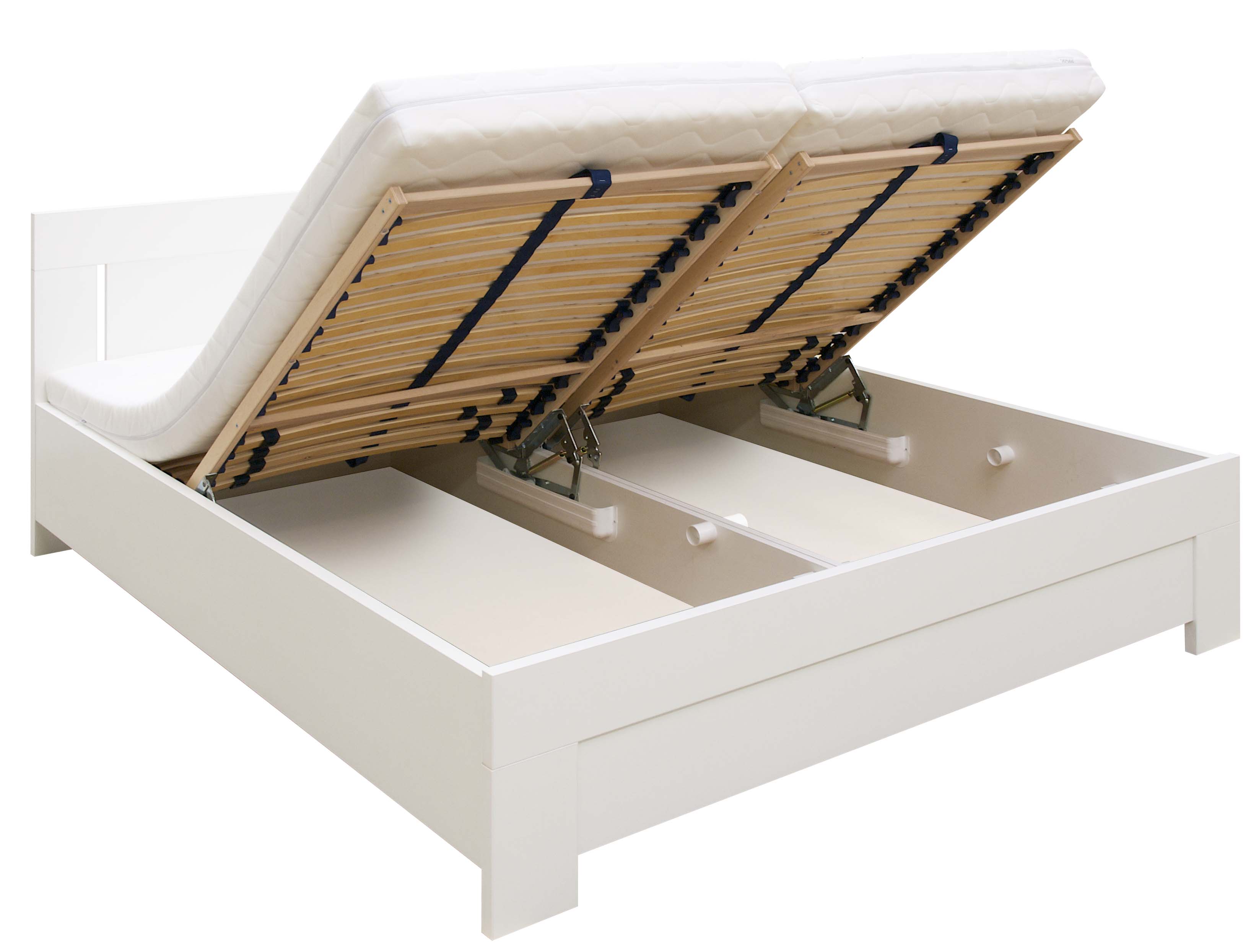 Materiál lamino tl.25 mm. S úložným prostorem přístupným od nohou a polohovatelnými rošty.šíře pro matraci 160 a 180 cm. výška lehací plochy 53 cm.Výběr z více dekorů.