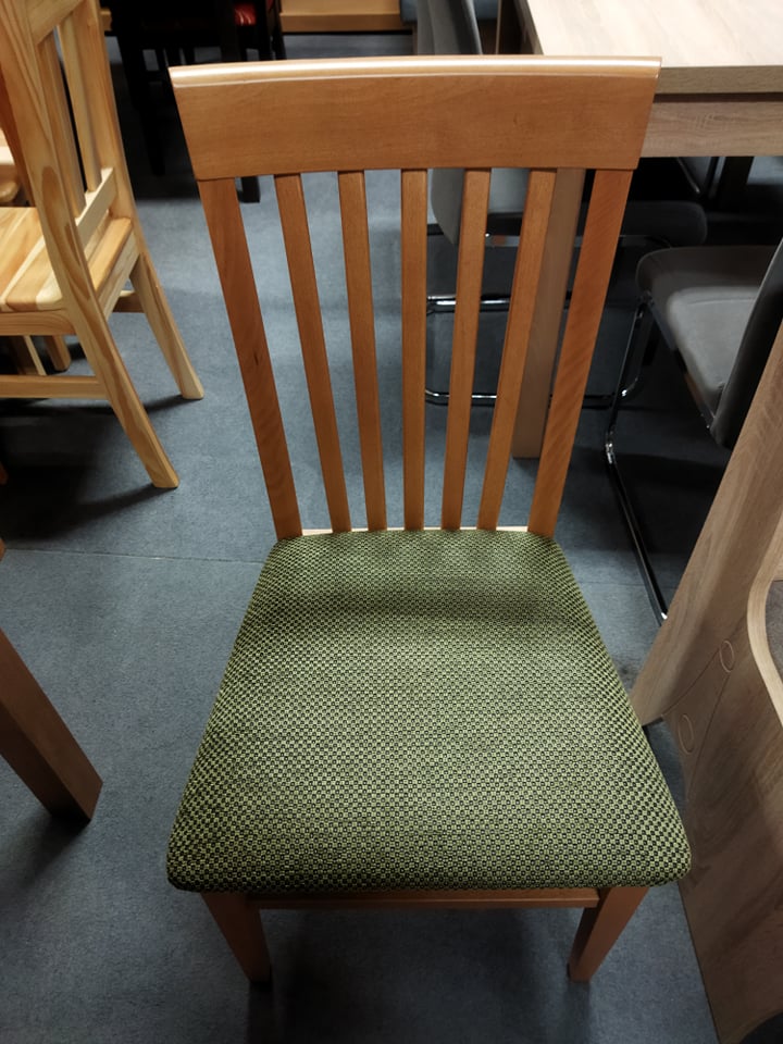 Jídelní židle s čalouněným sedákem. Výběr z 8 odstínů moření a mnoha potahových látek.