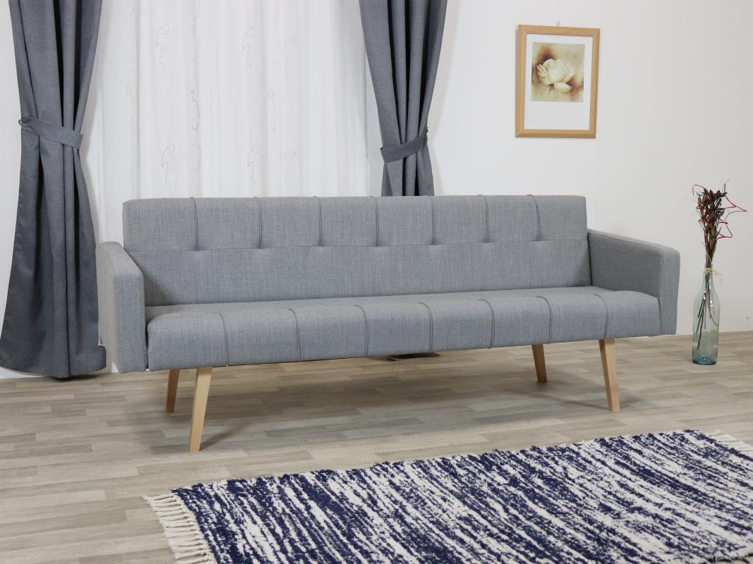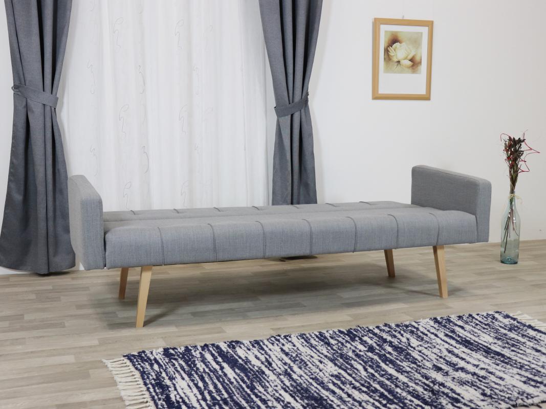 Rozkládací čalouněná lavice s područkama a s dřevěnýma nohama.
