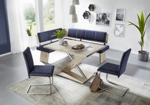 Rohová jídelní lavice v moderním provedení se vyrábí ve třech velikostech a můžete volit ze dvou provedení opěráků. Vyznačuje se moderním bokem lavice s kovovou patkou v provedení imitace nerez.