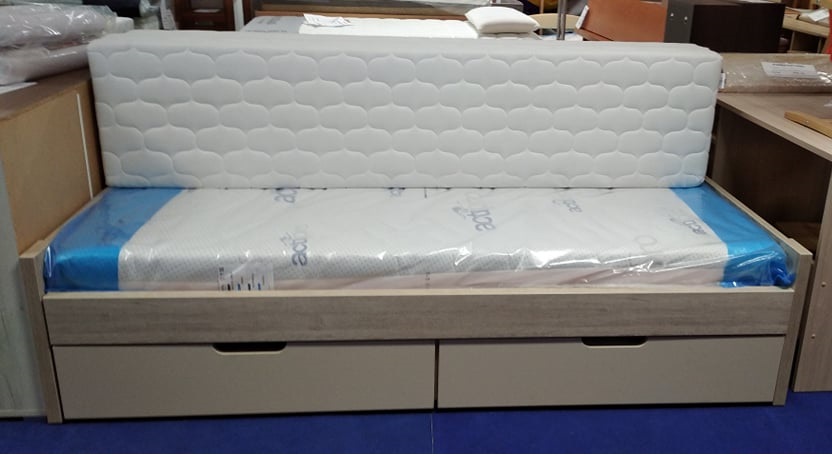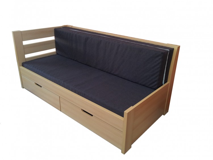 Praktické a chytré řešení pro spaní v malém prostoru. Postel přes den slouží jako pohovka, v noci jako kvalitní dvojlůžko určené pro každodenní spaní, součástí postele jsou dva úložné prostory. Postel je vyrobena z kvalitní laminované dřevotřísky o síle 25 a 36 mm s hranami olepenými odolnou 2 mm plastovou ABS hranou, zásuvky jsou opatřeny kuličkovými plnovýsuvy 80 cm, tím je používání zásuvek velice jednoduché a praktické. Součástí je masivní rozkládací rošt s nosností 100 kg na každou polovinu postele.